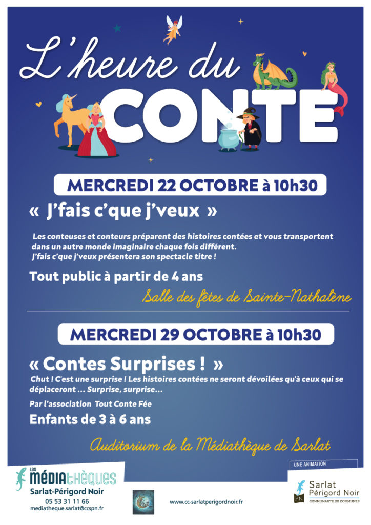 L’Heure du Conte à la Médiathèque de Sarlat mercredi 29 octobre à 10.30h Tout Conte Fée1 octobre 2025Leave a comment